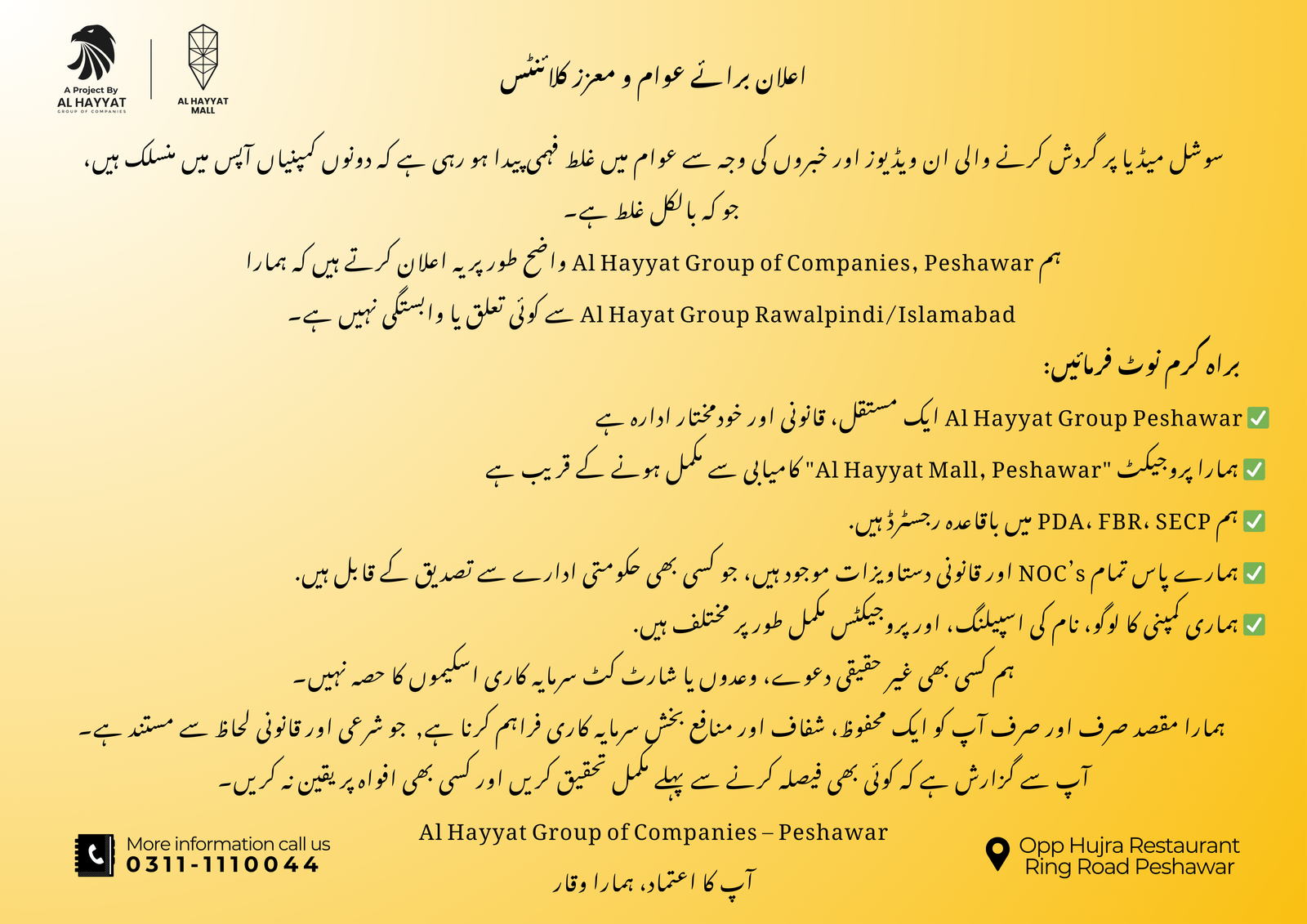 Al Hayyat Group Peshawar Has No Affiliation With Al Hayat Group Islamabad